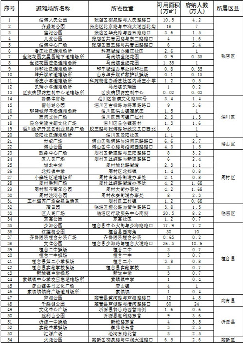 昨日,記者從市地震局了解到,淄博有54處應(yīng)急避難場所,張店區(qū)13處,桓臺縣12處、周村區(qū)9處、淄川區(qū)7處、高青縣5處、臨淄區(qū)3處、博山區(qū)、高青縣各2處以及高新區(qū)1處。避難可用面積約為345萬平方米,大約可容納138萬人的應(yīng)急需求。