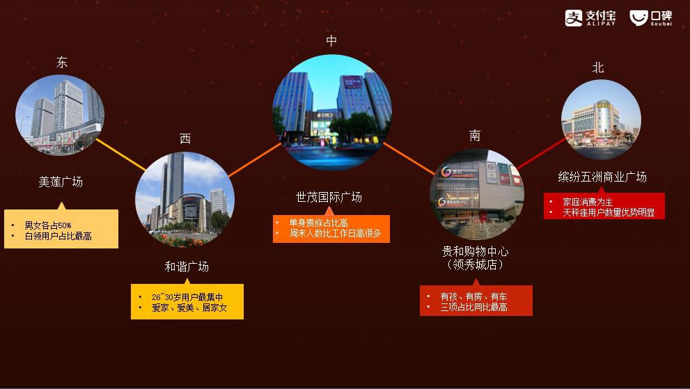 此外,口碑還給出了各大商圈的消費特征。口碑本地生活事業部總監杜曉明說,數據顯示,到世茂廣場消費的人群中單身比較多,而在去繽紛五洲商業廣場消費的則主要以家庭為主,和諧廣場顧客中26-30歲用戶集中,而到貴和購物中心的消費者 則主要是有房、有車的高消費群體。
