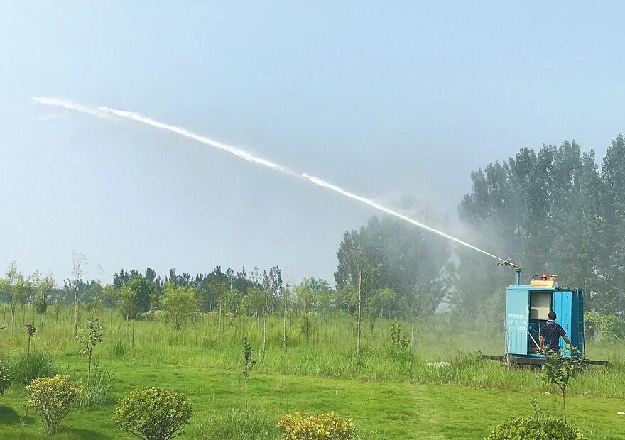 記者注意到,該渣土場降塵設備齊全,門口的揚塵監(jiān)測系統(tǒng)正常運轉,車輛進出工地經(jīng)洗車平臺沖洗后,還需經(jīng)過一旁的U形水池進行二次沖洗,確保車輛不帶泥上路。走入渣土場內部,兩臺遠程智能揚塵治理系統(tǒng)噴射出高高的水流,掃射半徑達60米,可謂是降塵“神器”。不遠處,幾名工人正在不間斷巡查,發(fā)現(xiàn)裸露地面立即覆蓋。