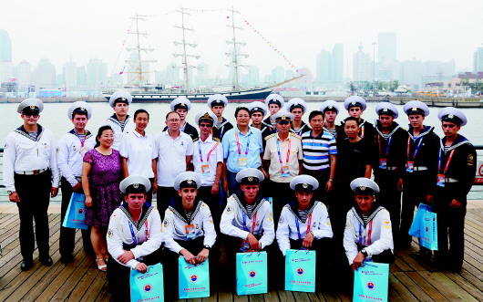 青島海洋技師學院師生代表與俄羅斯友人在“帕拉達”號大帆船前合影。