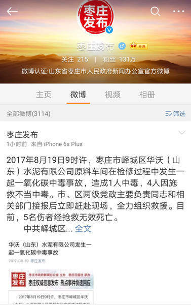 大眾網濟南8月19日訊 19日,據棗莊市嶧城區委宣傳部通報,2017年8月19日9時許,棗莊市嶧城區華沃(山東)水泥有限公司原料車間在檢修過程中發生一起一氧化碳中毒事故,造成1人中毒,4人因施救不當中毒。市、區兩級黨政主要負責同志和相關部門接報后立即趕赴現場,全力組織救援。目前,5名傷者經搶救無效死亡。(大眾網_山東24小時客戶端記者 王磊)