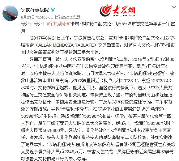 大眾網(wǎng)8月22日濟(jì)南訊記者從寧波海事法院官方微博獲悉,2017年8月21日上午,寧波海事法院公開宣判“卡塔利娜”輪二副艾倫 門多薩 塔布雷(ALLAN MENDOZA TABLATE)交通肇事案,對被告人艾倫 門多薩 塔布雷以交通肇事罪判處有期徒刑三年六個(gè)月。