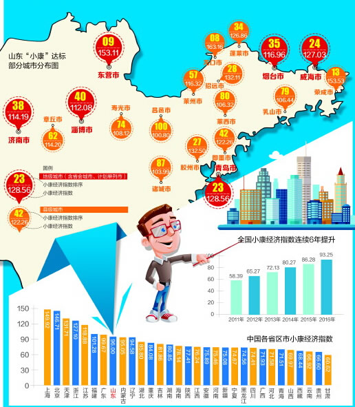 距2020年這一中國(guó)全面建成小康社會(huì)的目標(biāo)時(shí)間點(diǎn)已越來(lái)越近,各地任務(wù)完成進(jìn)度如何?8月21日,在北京發(fā)布的一份研究報(bào)告顯示,截至2016年末,中國(guó)164座城市率先達(dá)標(biāo)。其中,山東省有20個(gè)城市達(dá)到全面小康水平,排名全國(guó)第三,小康經(jīng)濟(jì)指數(shù)排名也進(jìn)入全國(guó)前10位。青島小康經(jīng)濟(jì)指數(shù)為128.56,在我國(guó)地級(jí)城市(含省會(huì)城市、計(jì)劃單列市)中排名第23位。膠州、即墨在縣級(jí)城市中分別排名第27位、42位。