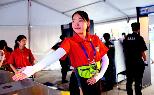 由于今年新增加了證件制作、實景秀觀眾席秩序維護等新崗位,不少志愿者都要身兼多職。位于金沙灘啤酒城中央舞臺的實景秀檢票口,志愿者在檢票工作完成后,還要進入觀眾席引導(dǎo)游客入席、維護觀眾席秩序等工作。