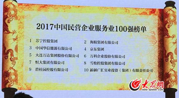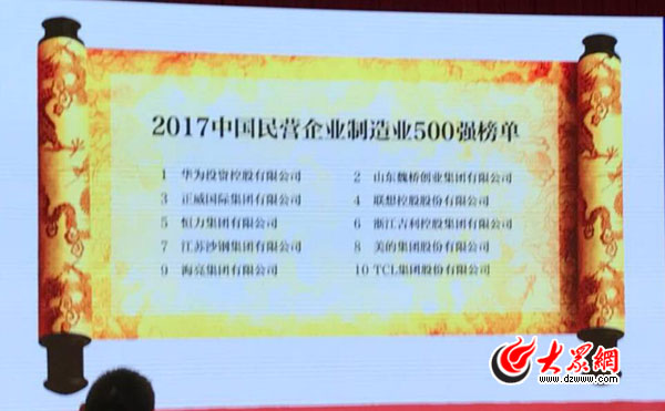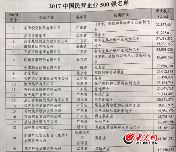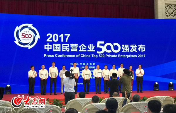 2017中國民營企業500強榜單今天上午在濟南揭曉。