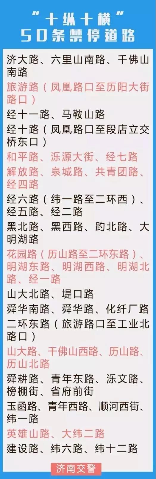 緯二路、緯十二路、經一路、經七路、經十路(段店立交東口至奧體東路路口)、濼源大街、和平路、旅游路(歷陽大街至舜華路口)、明湖東路、明湖西路、明湖北路、花園路、二環東路(旅游路口至工業北路口)、歷山路、英雄山路。