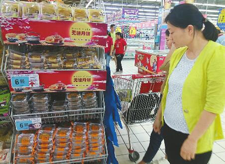 市中區英雄山路附近一超市內,消費者在無糖月餅區駐足。 記者王晶 攝