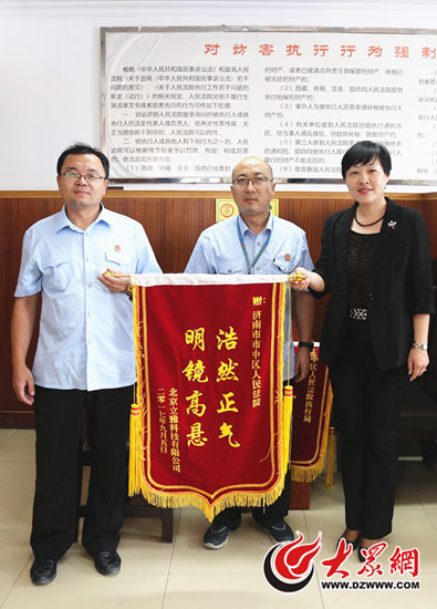 6日,劉某某來到濟南市市中區法院,給法官送來了一面“浩然正氣 明鏡高懸”的錦旗。劉某某追要4年多未果的1000萬欠款,在法院“百日執行攻堅”活動中最終得以執行。而這起案件的欠款人莊某某在8月1日被法院提請檢方批捕,該案也是今年濟南市執行案件中首個批捕案例。