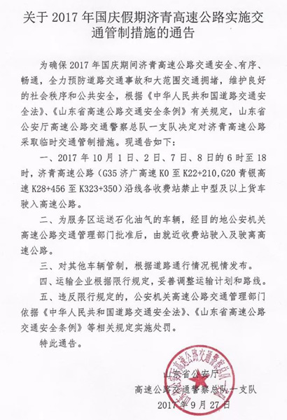 國慶假期期間濟青高速北線將對大中型貨車實行分時段交通管制