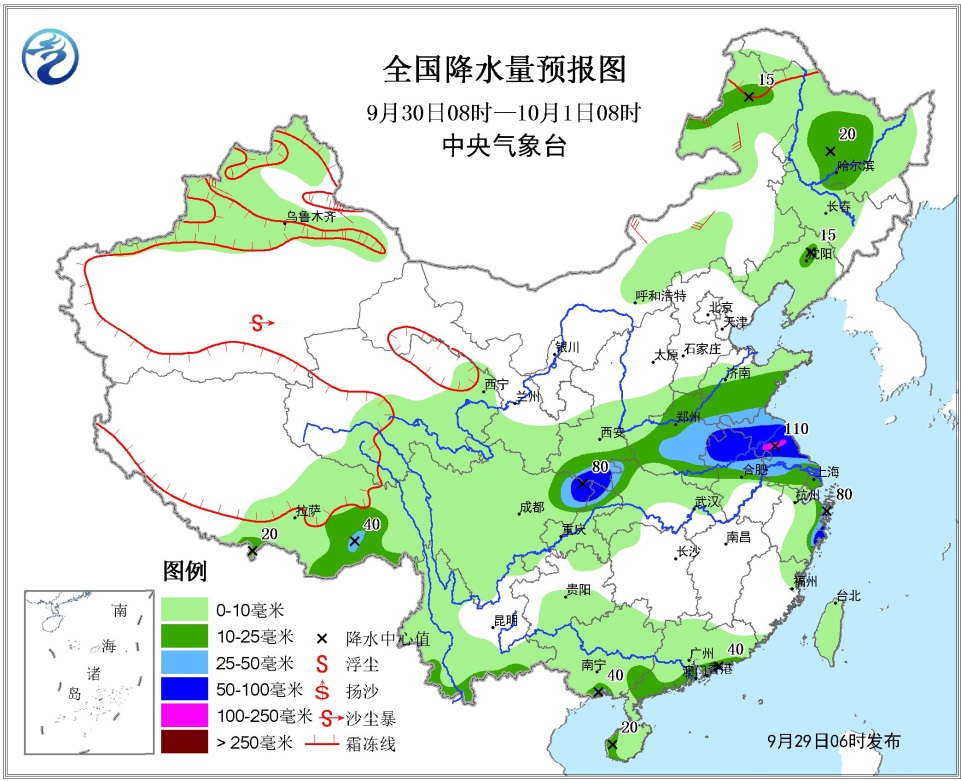 9月30日08時至10月1日08時,四川盆地東北部、黃淮中南部、江淮東部等地有較強降水。四川盆地東北部、陜西東南部、湖北西北部、河南、山東南部、安徽中北部、江蘇、浙江北部和東部沿海以及云南南部、兩廣南部沿海、海南島西部等地有中雨或大雨,其中四川東北部、重慶北部、陜西南部、安徽北部、江蘇中北部等地的部分地區有暴雨,局地大暴雨。