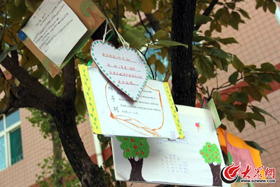 學生們把收集到的有關于保護樹木過冬的資料制作成“小樹牌”,掛在學校的柿子樹上。