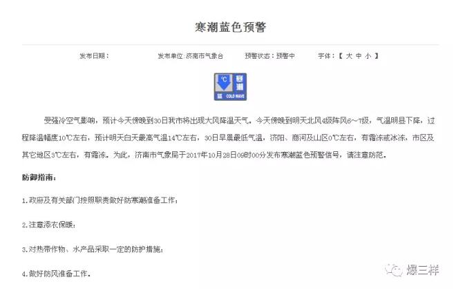 為此,濟(jì)南市氣象局于2017年10月28日09時00分發(fā)布寒潮藍(lán)色預(yù)警信號。