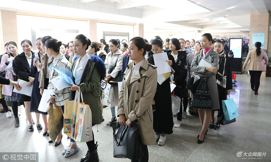 2017年11月3日,青島,準備參加東航山東分公司空乘人員復試的美女、帥哥正在青島旅游學校大廳內等候,準備再次接受評委的面試審核。