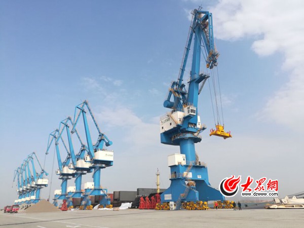 在濰坊港中港區的18號至21號泊位,碼頭上吊裝作業正在順利進行