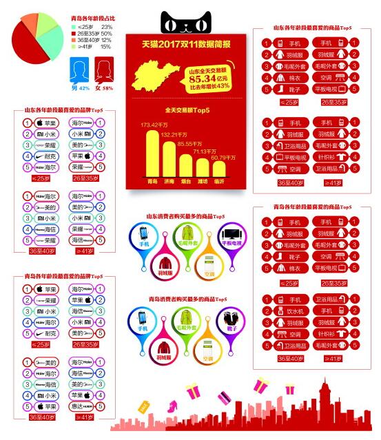 大眾網11月13日訊 11秒,1億;28秒,10億;3分01秒,100億;40分12秒,500億……至11月11日24時,“2017天貓雙11全球狂歡節”直播大屏上交易數據定格在1682億元,無線交易占比90%,創下了新的紀錄。昨日,記者從阿里巴巴方面了解到,今年雙11,山東省全天交易額達到85.34億元,其中青島全天交易額達17.3億元,位居全省17地市首位。而在這場消費狂歡中,手機、羽絨服、毛呢外套最受青島消費者的喜愛。島城企業則搭上雙11快車連創佳績,新零售能量全面爆發。
