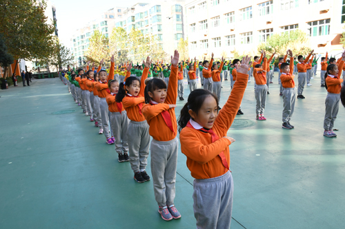 大眾網濟南11月14日訊 “ABCDEFG,HIJKLMN…”14日上午,伴隨著動感的音樂,濟南外國語學校開元國際分校二三年級的孩子們正在練習TPR趣味語音操,標準洪亮的發音、 熱力四射的動作和陽光燦爛的微笑,成了開元校園里靚麗的風景。