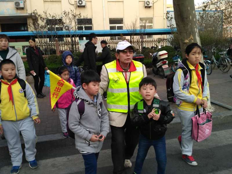 煙臺(tái)養(yǎng)正小學(xué)門(mén)口,交通志愿者護(hù)送學(xué)生過(guò)馬路。通訊員 全福攝