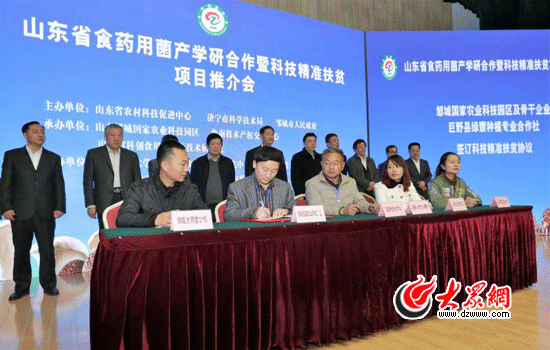 大眾網(wǎng)濟南11月17日訊 為充分發(fā)揮國家農(nóng)業(yè)科技園區(qū)的輻射帶動作用,探索“農(nóng)業(yè)科技園區(qū)+龍頭企業(yè)(研究院)+合作社”的精準扶貧模式,鄒城國家農(nóng)業(yè)科技園區(qū)主動跨區(qū)域與巨野縣綠蕈種植專業(yè)合作社合作,在巨野獨山鎮(zhèn)共建“鄒城國家農(nóng)業(yè)科技園區(qū)科技精準扶貧示范園”。11月15日,在山東省食藥用菌產(chǎn)學研合作暨科技精準扶貧項目推介會上,鄒城國家農(nóng)科技園區(qū)龍頭企業(yè)山東福禾菌業(yè)科技有限公司與我省扶貧工作重點區(qū)域菏澤市巨野縣獨山鎮(zhèn)后集村、東隅村簽訂了科技精準扶貧協(xié)議,鄒城園區(qū)為其無償提供玉木耳、平菇等食用菌的菌包及技術(shù)指導,回收鮮菇,幫助當?shù)剞r(nóng)戶脫貧致富。