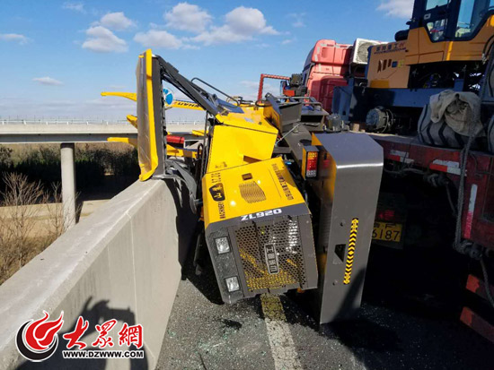 大眾網濟南11月20日訊 18日下午14:30左右,青島交警濰萊高速民警巡邏至青新高速郭家埠立交時發現,一輛拉載挖掘機的大貨車停在榮烏高速轉青新高速的匝道上。原來,一輛挖掘機從貨車上側翻倒在了匝道上阻塞了交通,大貨車司機稱這些挖掘機是從萊州發往廣西的,因為轉彎時車速較快,固定挖掘機的繩索發生斷裂,導致一輛挖掘機側翻。民警通知救援單位派吊車來清障,經過半個多小時的忙碌,側翻的挖掘機被移出現場。目前,濰萊高速交警正對萊州多家挖掘機制造商、物流公司發放安全隱患整改通知書,要求他們及時改正運輸問題。(大眾網-山東24小時記者 賀輝 通訊員 付永斌)