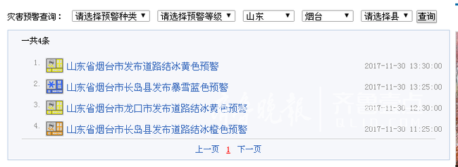 今天上午,煙臺市區開始飄落零星雪花,從中午開始,煙臺萊山區、芝罘區等地已開始出現明顯的降雪。13時30分,煙臺市氣象臺發布道路結冰黃色預警信號:受冷空氣影響,今天上午開始,煙臺市北部地區出現降雪。截至目前,長島降雪4.3毫米、龍口降雪1.5毫米、蓬萊降雪0.3毫米、招遠降雪0.3毫米、牟平降雪0.2毫米。