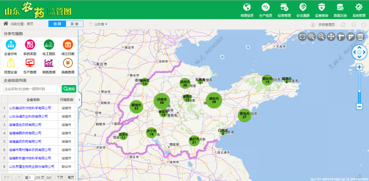 據楊武杰介紹,山東農藥監管圖主要是由1個中心、2張網絡、3個管理層級、4個數據接口(1234)組成,即:1個農藥監管中心,利用大數據技術,為全省農藥監管部門及企業用戶提供統一登錄界面,統一用戶管理,實現數據集中存儲;2張網分別是內網、外網,內網主要服務于省、市、縣各級農藥監管部門,通過內網可以查詢生產企業的位置、聯系人、法人、農藥生產類型等詳細信息,外網主要服務于社會大眾,為人民群眾提供農藥購買、使用查詢,也可對各級農藥管理部門、農藥生產企業、經營業戶進行社會監督;3個層級是指為省、市、縣三級農業管理部門提供農藥監管服務,進一步增強各級、各部門之間的聯系與合作,實現重案通報,農藥市場監管信息一地發布、區域聯動,提高執法案件處理能力;4個數據接口是指山東農藥監管圖與山東省政務服務網、農業部農藥綜合管理網、農藥生產企業網、農藥經營網4張網絡的數據交換接口,實現許可審批、農藥登記、農藥生產、農藥經營、農藥使用等全產業鏈條數據的共享與交換。