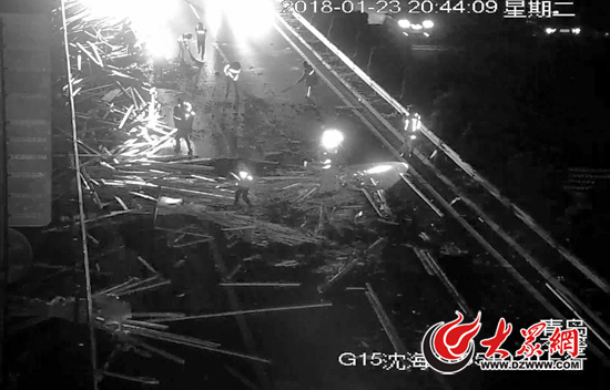 掉落的木材造成交通短時封閉,交警和路政緊急清理現場
