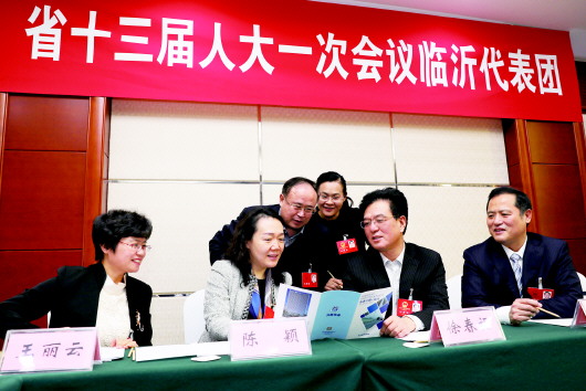1月27日,出席省十三屆人大一次會議的臨沂團徐春福代表(右二)向陳穎、張善久、徐光琴、徐仲圣(從左至右)等代表介紹光伏路面節能情況,就打好精準脫貧攻堅戰,助力沂蒙老區高質量發展展開熱烈討論。記者 王世翔 報道