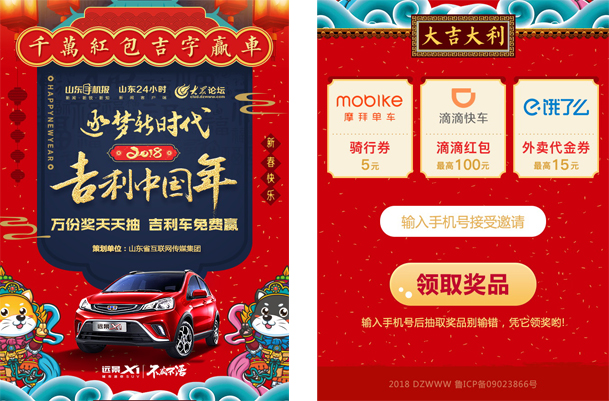 2月16日(正月初一),山東手機報客戶端推出終極重磅大禮:當天在山東手機報客戶端參與整點互動,集齊“吉”“利”“中”“國”“年”五個字,即可參與汽車大獎抽獎活動,吉利遠景X1汽車等你開回家!