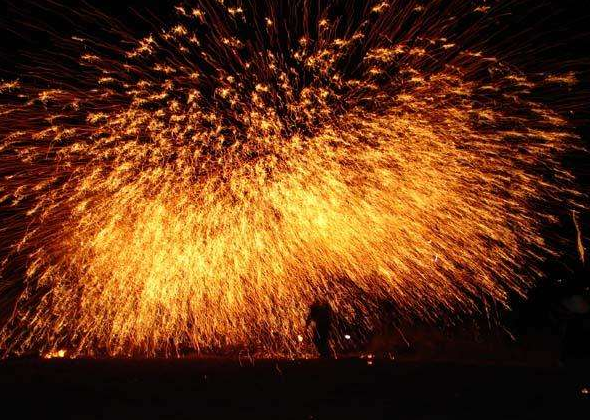 村民手拿盛有鐵水的桶,在夜幕中,呈圓形用力掄,鐵花濺起,形成一個個花環,F如今能夠熟練掌握這一技藝的人越來越少。近年來,為延續這一傳統民俗,讓村民在春節感受到傳統的年味,宋家村在掄鐵花上進行創新,通過自主研發逐漸用機器取代了人工,大大降低了人員操作的風險,而通過控制機器轉速的快慢,豐富了鐵花的形狀。