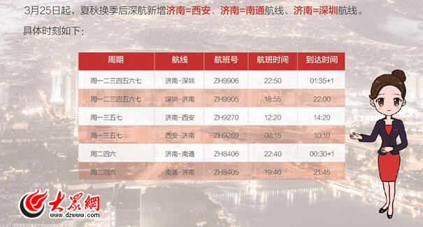 大眾網(wǎng)濟(jì)南3月22日訊 記者從濟(jì)南機(jī)場獲悉,3月25日起,深圳航空新開通濟(jì)南=長沙、濟(jì)南=南通航線,最低220元就能飛。