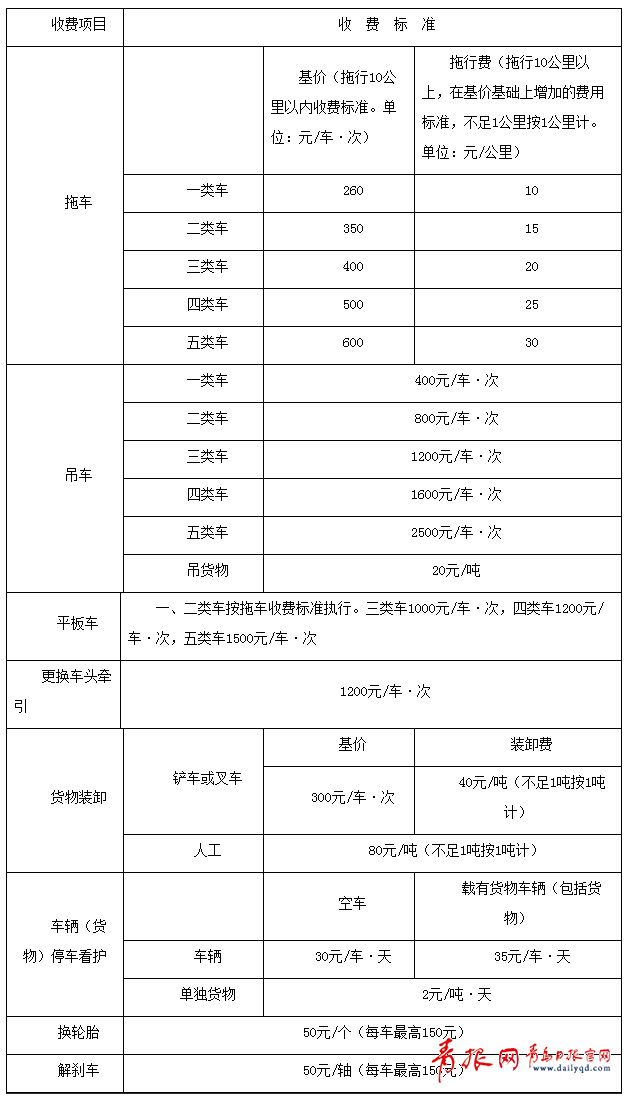 省物價局、省交通運輸廳聯合下發通知決定,從5月1日起實施高速公路車輛救援清障服務新的收費標準。5.救援過程中拖車同時開展吊車作業,收取拖車費后,吊車收費按50%計收。7.車輛(貨物)停車看護費執行各市收費標準,但不得超過上述標準。[詳細]
