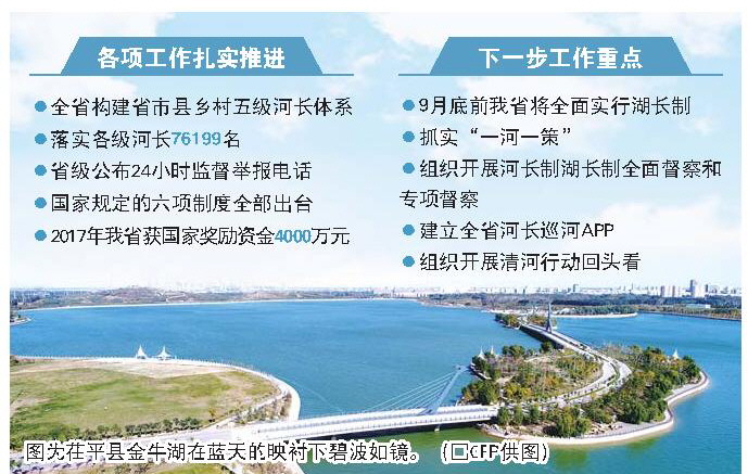 中央部署河長(zhǎng)制湖長(zhǎng)制工作以來(lái),我省各項(xiàng)工作扎實(shí)有序開(kāi)展。目前,全省構(gòu)建了省市縣鄉(xiāng)村五級(jí)河長(zhǎng)體系,落實(shí)各級(jí)河長(zhǎng)76199名,設(shè)立了46047塊河長(zhǎng)公示牌,省級(jí)公布了24小時(shí)監(jiān)督舉報(bào)電話,河長(zhǎng)會(huì)議、信息共享、信息報(bào)送、督察、考核、驗(yàn)收等國(guó)家規(guī)定的六項(xiàng)制度全部出臺(tái)。通過(guò)建立完善河湖治理機(jī)制,全省開(kāi)展了清河行動(dòng)和入河排污口綜合整治,累計(jì)清理違章建筑和違法活動(dòng)54531處,封堵非法設(shè)置的排污口2120個(gè)。2017年,我省作為全國(guó)河長(zhǎng)制工作成效突出省份,獲國(guó)家獎(jiǎng)勵(lì)資金4000萬(wàn)元。