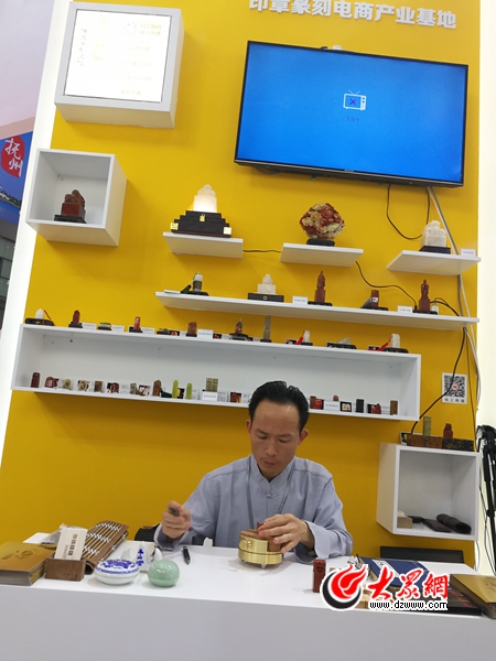 在曲阜印章展臺,孔府印閣的篆刻師張國亮現(xiàn)場展示傳統(tǒng)篆刻技藝。