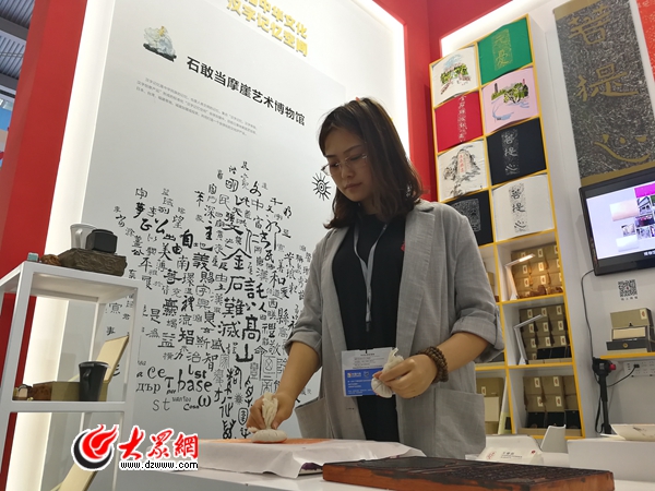 在石敢當(dāng)摩崖藝術(shù)博物館展臺,工作人員現(xiàn)場演示“孔子見老子傳拓體驗(yàn)板”。