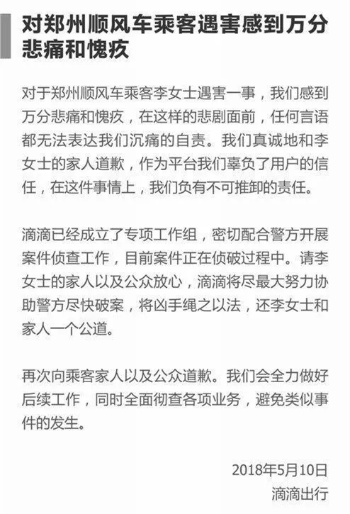 10日13:40左右,滴滴出行就此事回應稱,“我們感到萬分悲痛和愧疚,在這樣的悲劇面前,任何言語都無法表達我們沉痛的自責。我們真誠地和李女士的家人道歉,作為平臺我們辜負了用戶的信任,在這件事情上,我們負有不可推卸的責任。”回應稱,滴滴出行已經成立了專項工作組,密切配合警方開展案件偵查工作,目前案件正在偵破過程中。滴滴向乘客家人以及公眾道歉,會全力做好后續工作,同時全面徹查各項業務,避免類似事件的發生。