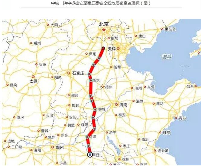 中標(biāo)信息正文下方附帶了一張地圖,根據(jù)圖片顯示的信息,這條高鐵將經(jīng)過天津進入到河北,從衡水斜著進入到山東,途經(jīng)聊城以及菏澤后,抵達(dá)終點商丘。