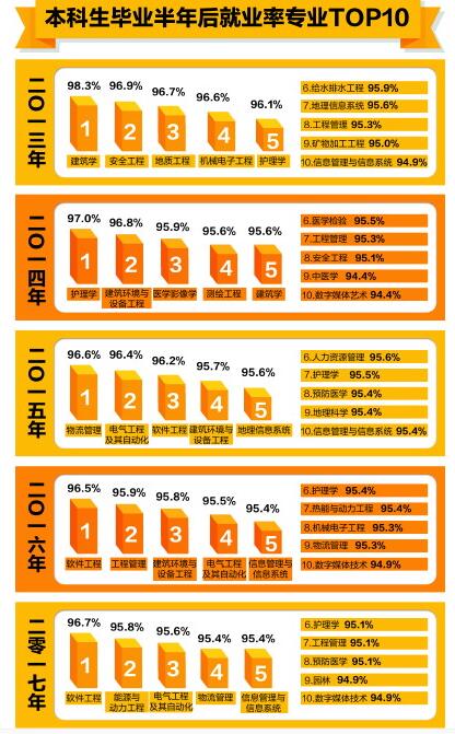 專業(yè)、就業(yè)無疑是學生與家長在高考季最為關注的話題,就業(yè)率是高考生和家長在志愿填報時非常關注的重要因素。為此,麥可思研究院整合2013~2017年大學畢業(yè)生就業(yè)率數(shù)據(jù),呈現(xiàn)出近5年大學專業(yè)的就業(yè)狀況趨勢。數(shù)據(jù)顯示,隨著信息技術產業(yè)的快速發(fā)展,近兩屆軟件工程專業(yè)就業(yè)率排在榜首,而護理學則連續(xù)五年出現(xiàn)在就業(yè)率Top10名單之列。