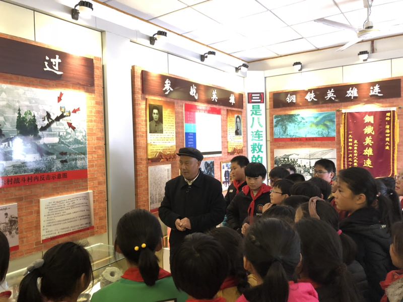 朱村抗日紀念館義務講解員王經臣為村小學學生講解戰斗歷史和大眾日報報道,五年來紀念館已接待游客10多萬人。
