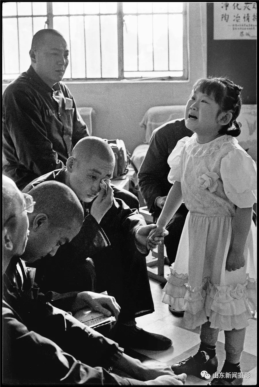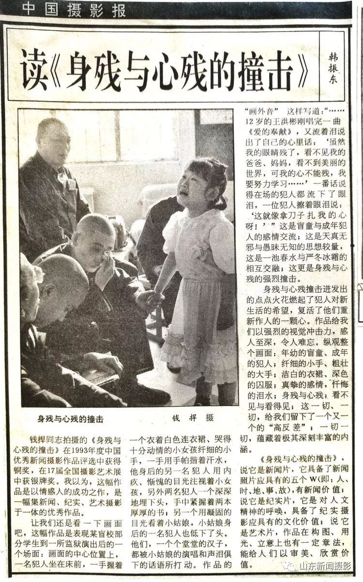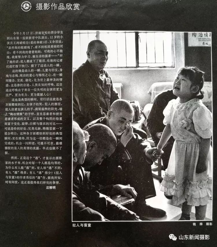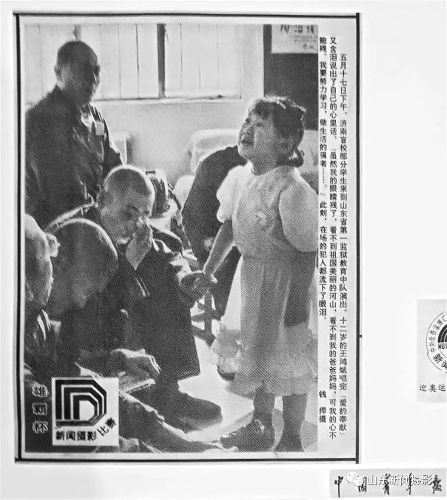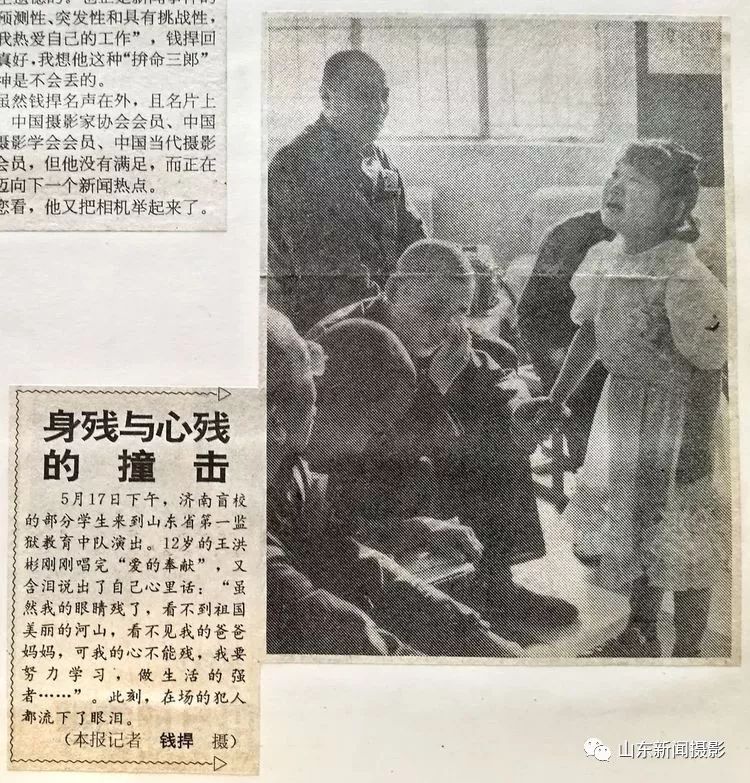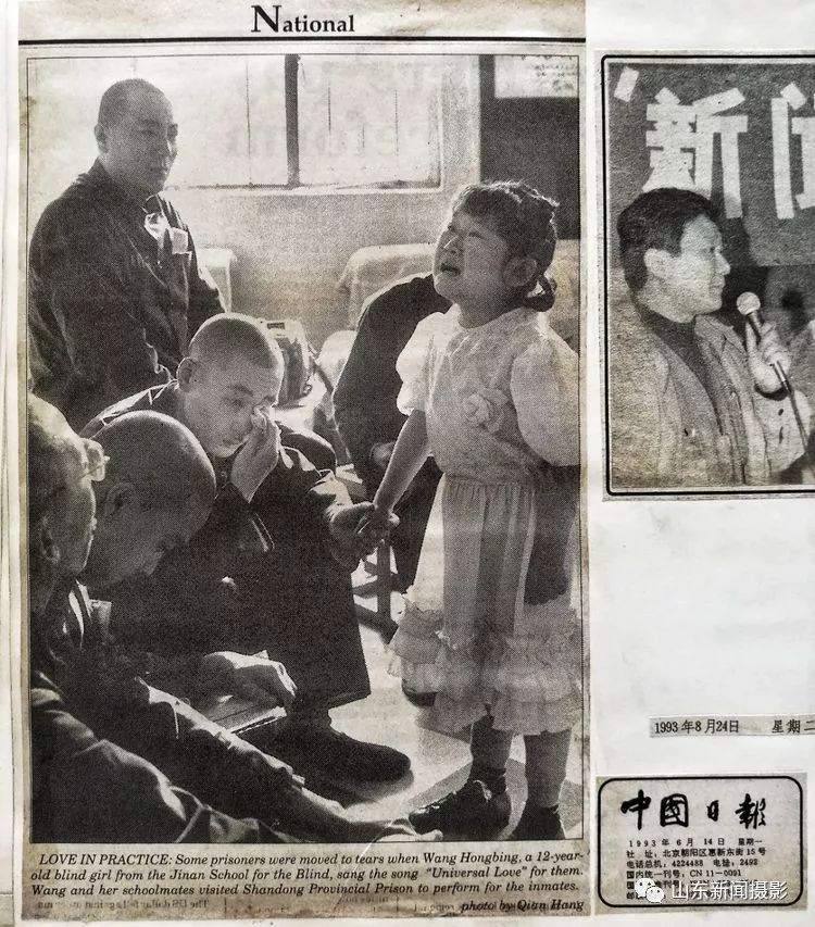 1993年5月17日,濟(jì)南盲校的部分學(xué)生來到山東省第一監(jiān)獄教育中隊(duì)演出。12歲的小演員王鴻斌唱完"愛的奉獻(xiàn)“,又含淚說:"雖然我眼睛殘了,看不到祖國(guó)美麗的河山,看不到我的爸爸媽媽,可我的心不能殘。我要努力學(xué)習(xí),做生活的強(qiáng)者……” 聽了她的話,犯人都流下了眼淚。在場(chǎng)的記者連忙按下快門,拍下了這動(dòng)人的一瞬。