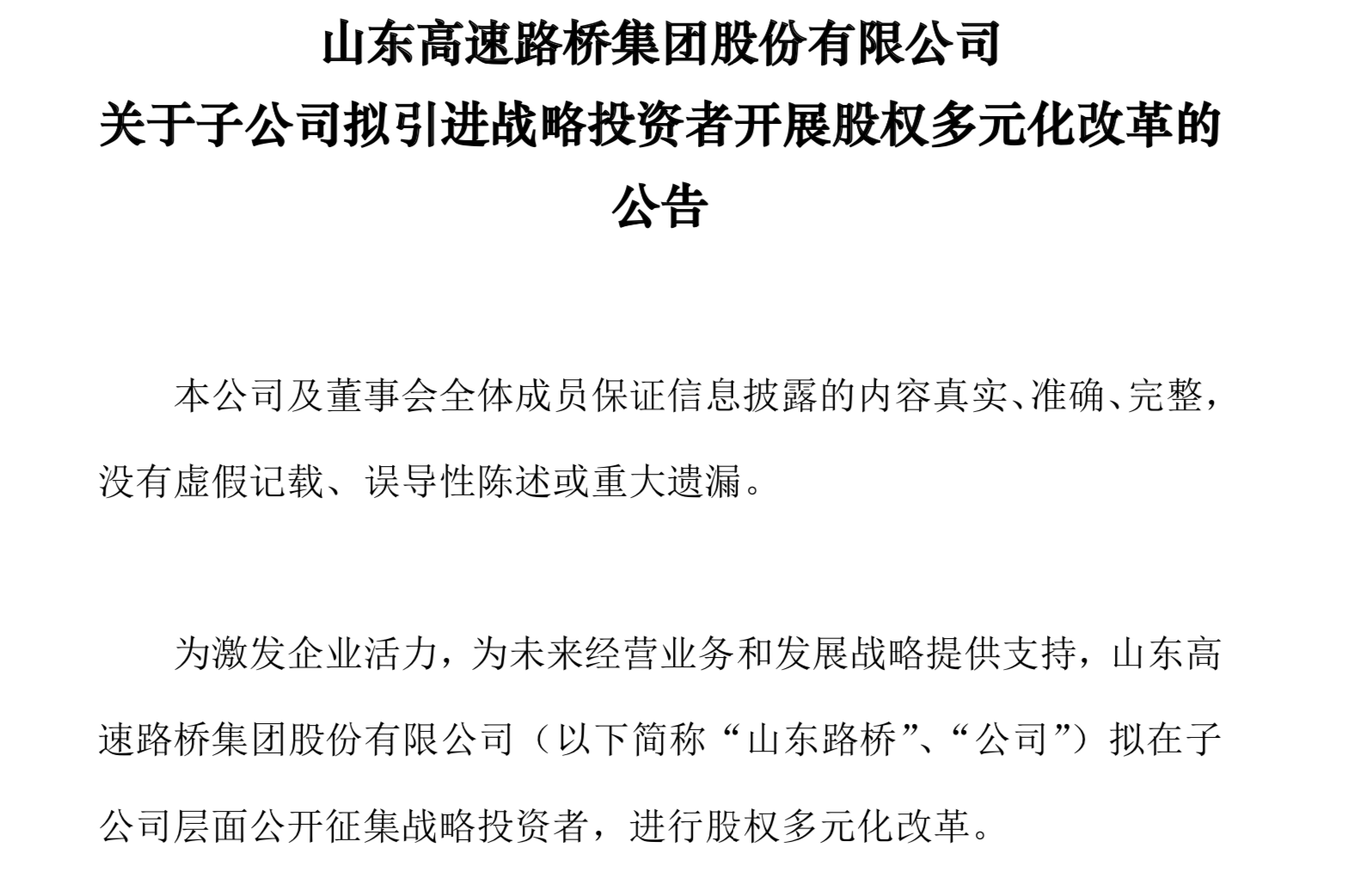 公告稱,本次公開征集意向戰略投資者,擬采用增資擴股、存量股份轉讓或兩者結合的方式,進行股權多元化改革。意向戰略投資者應具有良好的資信能力及市場聲譽,與山東路橋相關子公司主業有一定關聯度或互補性,能夠產生協同效應,有助于培育壯大公司創新發展的新動能;認同山東路橋的企業文化與管理理念,促進相關子公司優化治理機制和經營機制等。