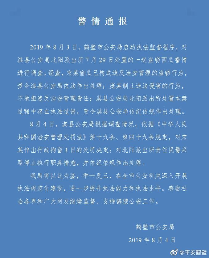 大眾網·海報新聞濟南8月4日訊(記者 吳軍林)4日,鶴壁市公安局就“瓜農抓賊倒賠三百”發出最新通報稱,8月3日,鶴壁市公安局啟動執法監督程序,對淇縣公安局北陽派出所7月29日處置的一起盜竊西瓜警情進行調查。經查,宋某偷瓜已構成違反治安管理的盜竊行為,對其作出行政拘留3日的處罰決定;龐某制止違法侵害的行為,不承擔違反治安管理責任。