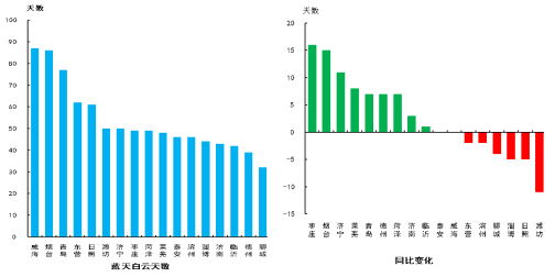 “藍天白云,繁星閃爍”天數最多的城市是威海市,為87天,最少的是聊城市,為32天。“藍天白云,繁星閃爍”天數同比增加最多的是棗莊市,為16天;泰安市和威海市同比持平;東營等6市同比減少,濰坊市同比減少最多,為11天。