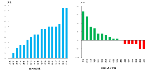 重污染天數最少的是威海市,為0天,最多的是德州市和聊城市,為19天。重污染天數同比減少最多的是濟寧市,為17天;青島市同比持平;濰坊市和濱州市同比增加最多,為5天。
