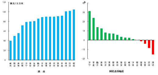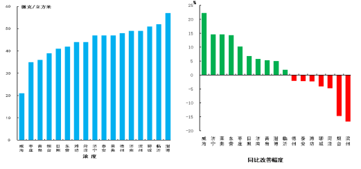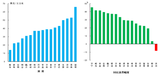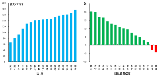可吸入顆粒物濃度最好的城市是威海市,為66μg/m3,最差的城市是聊城市,為177μg/m3。15市同比改善,改善幅度最大的是臨沂市,為20.3%;同比惡化幅度最大的是濰坊市,為4.3%。