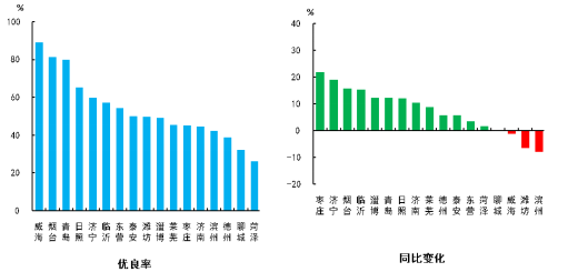 優良率最好的城市是威海市,為89.0%,最差的城市是菏澤市,為26.0%。13市同比改善,改善幅度最大的是棗莊市,為21.7個百分點;聊城等4市同比下降,下降幅度最大的是濱州市,為8.0個百分點。