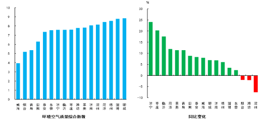 環境空氣質量綜合指數最好的城市是威海市,為3.94,最差的城市是聊城市,為8.85。14市均同比改善,改善幅度最大的城市是濟寧市,為24.1%;3市同比惡化,惡化幅度最大的城市是濱州市,為7.5%。