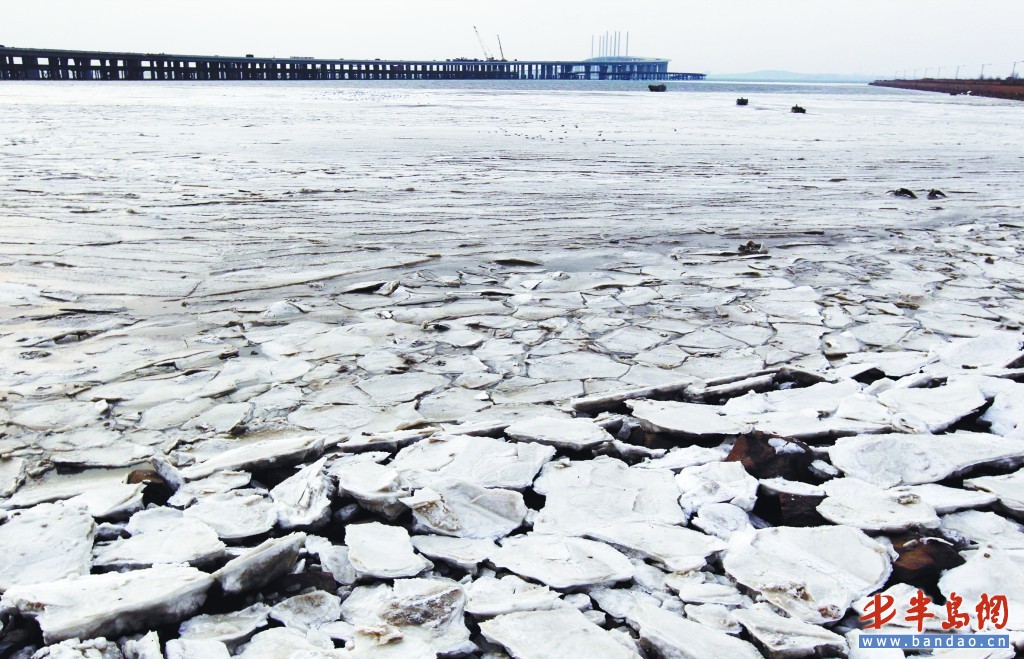 冷空氣卷土重來,不僅拉低了本市的溫度,也推動了膠州灣的冰情發展速度。5日,記者來到跨海大橋附近看到,海冰龜裂般鋪在海岸上,并伸向海里。白色的“冰磚”漂浮在海面上,“冰帶”綿延數百米。