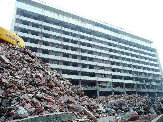 本報連續獨家報道齊魯賓館爆破的消息后,齊魯賓館何時爆破就一直牽動著濟南市民尤其是賓館周圍居民的心。22日下午,記者在位于經十路與千佛山路交叉口東南角的齊魯賓館看到,與前幾日相比,齊魯賓館老樓的拆除工作有了明顯進展。自12日下午開始,齊魯賓館的拆除工作已經持續進行了11天,目前,11層35米高的齊魯賓館的一、二層已經完全被掏空,幾輛大型挖掘機正在清理拆下的建筑垃圾材料。齊魯賓館老樓的東側,磚頭、水泥板、鋼筋等材料堆積得像座小山。
