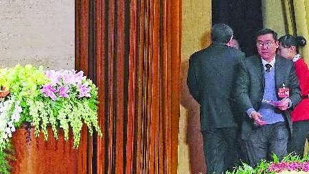 張成如委員與剛剛退場的發言人擦肩而過。14日上午的政協大會發言安排非常緊湊,每人發言時間只有5分鐘。 本報記者 邱志強 攝