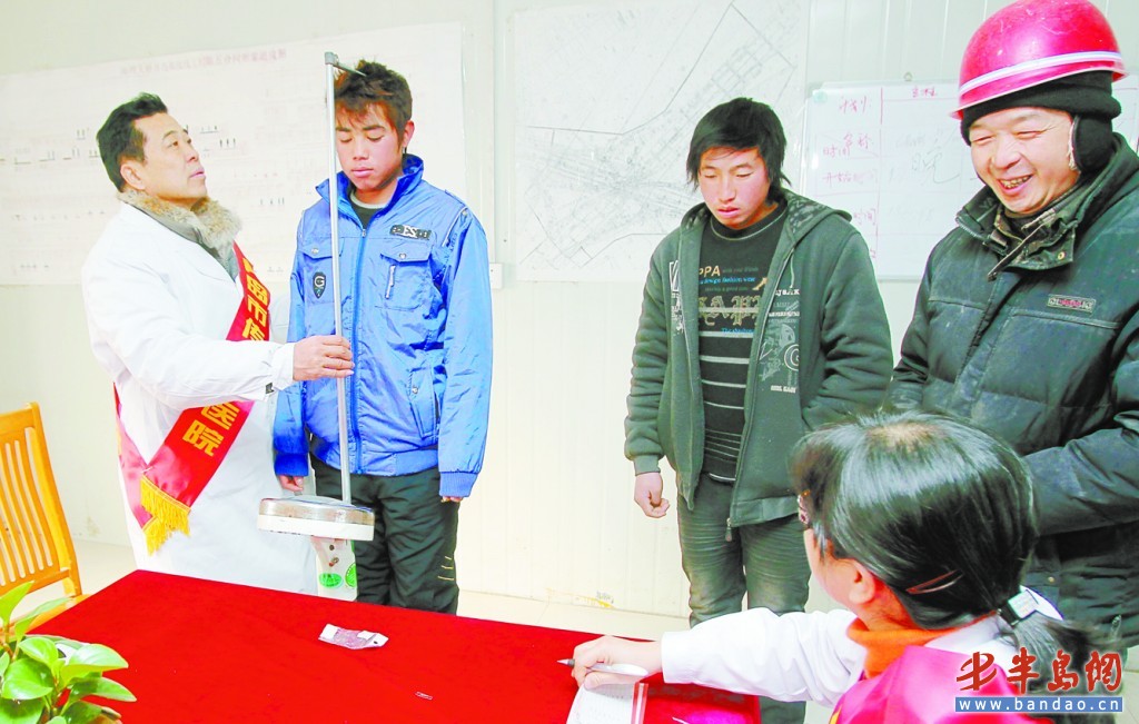 1月27日,市第六人民醫院醫護人員到海灣大橋施工現場為工人體檢,預防職業病。